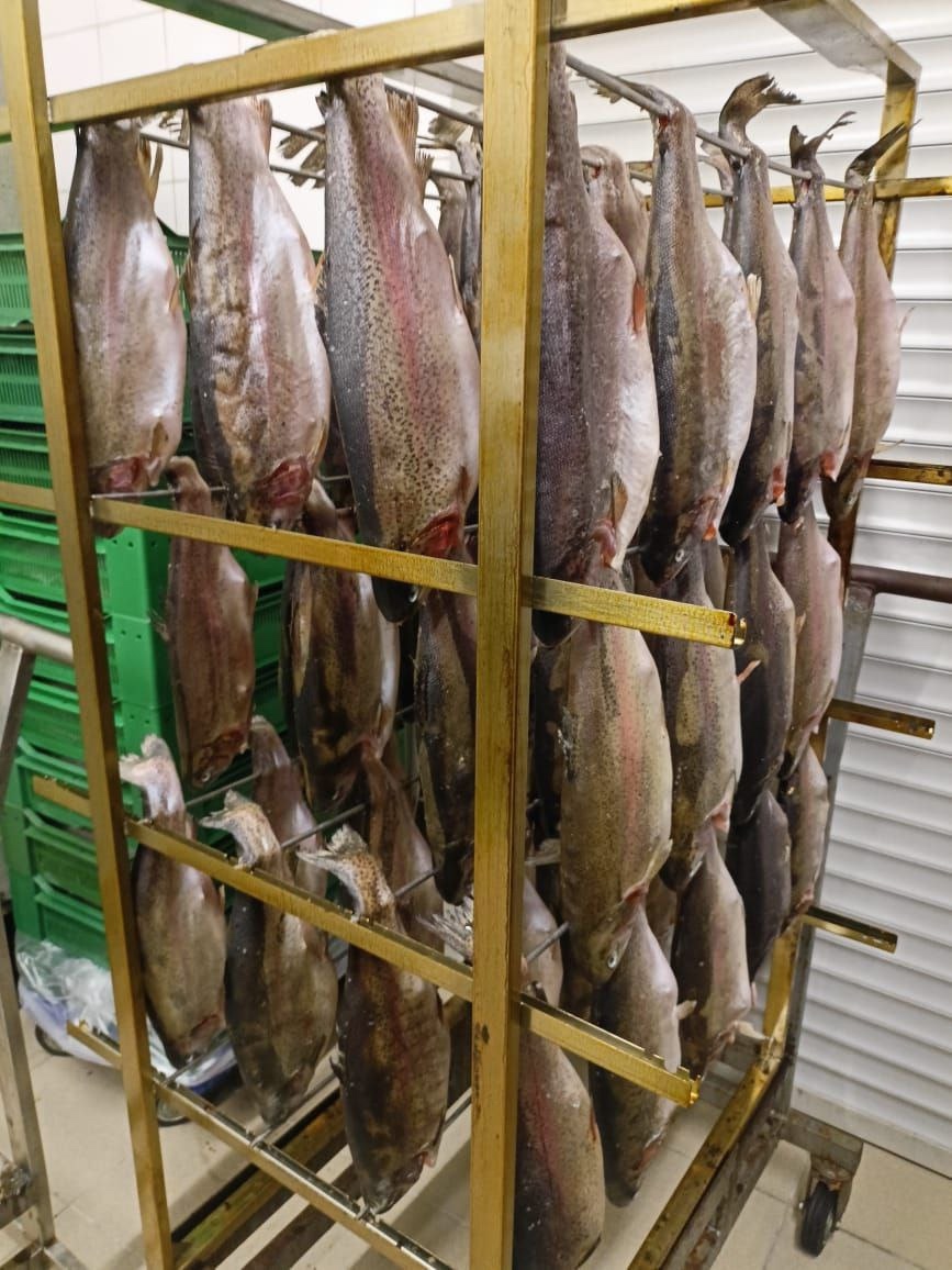 Далее участники делегации посетили форелевое хозяйство Группы компаний «Приладожье», где ознакомились с работой рыбоперерабатывающего цеха, выпускающего продукцию из форели под брендом «Приладожье».Мощность цеха составляет около 500 кг рыбы в сутки, продукция реализуется преимущество через интернет-магазин. Также гостям показали работу рыбоводного цеха в садковом хозяйстве.